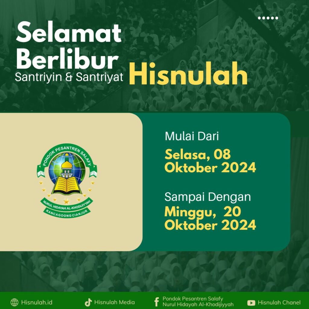 Assalamu’alaikum Warahmatullahi Wabarakatuh, Dengan ini kami sampaikan kepada seluruh santri Pondok Pesantren Salafy Nurul Hidayah Al-Khodijiyyah bahwa, setelah lebih dari seminggu melaksanakan rangkaian kegiatan Haflah Akhirussanah, Pondok Pesantren Salafy Nurul Hidayah Al-Khodijiyyah memberikan kesempatan kepada seluruh santri untuk bertemu dengan keluarga tercinta. Sehubungan dengan hal tersebut, seluruh santri akan mendapatkan libur selama 10 hari, dimulai […]