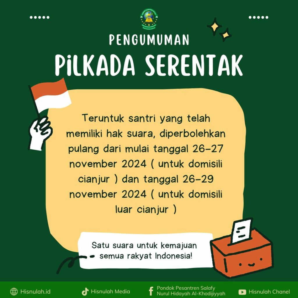 Assalamu’alaikum warahmatullahi wabarakatuh, Kami informasikan kepada seluruh santri Hisnulah yang telah memiliki hak suara, bahwa para santri diperbolehkan untuk pulang sesuai dengan ketentuan berikut: Santri yang berdomisili di Kabupaten Cianjur Diperbolehkan pulang mulai Selasa, 26 November 2024 hingga Rabu, 27 November 2024. Santri yang berdomisili di luar Kabupaten Cianjur Diperbolehkan pulang mulai Selasa, 26 November […]